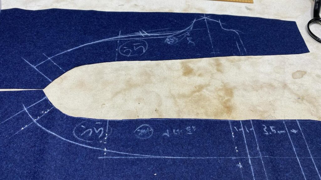 パンツの前身をくせ取りしたるので、製図よりも前身頃を製図の代わりに使って断つのがベターですね![]()