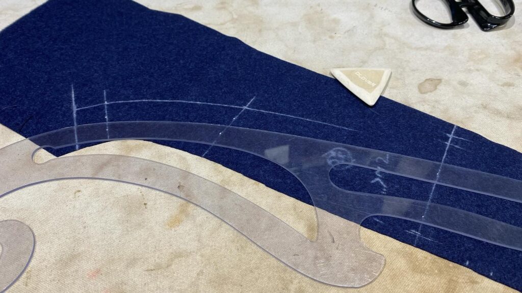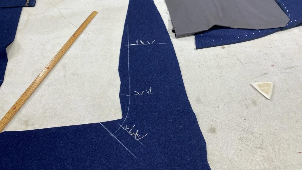 パンツの前身をくせ取りしたるので、製図よりも前身頃を製図の代わりに使って断つのがベターですね![]()